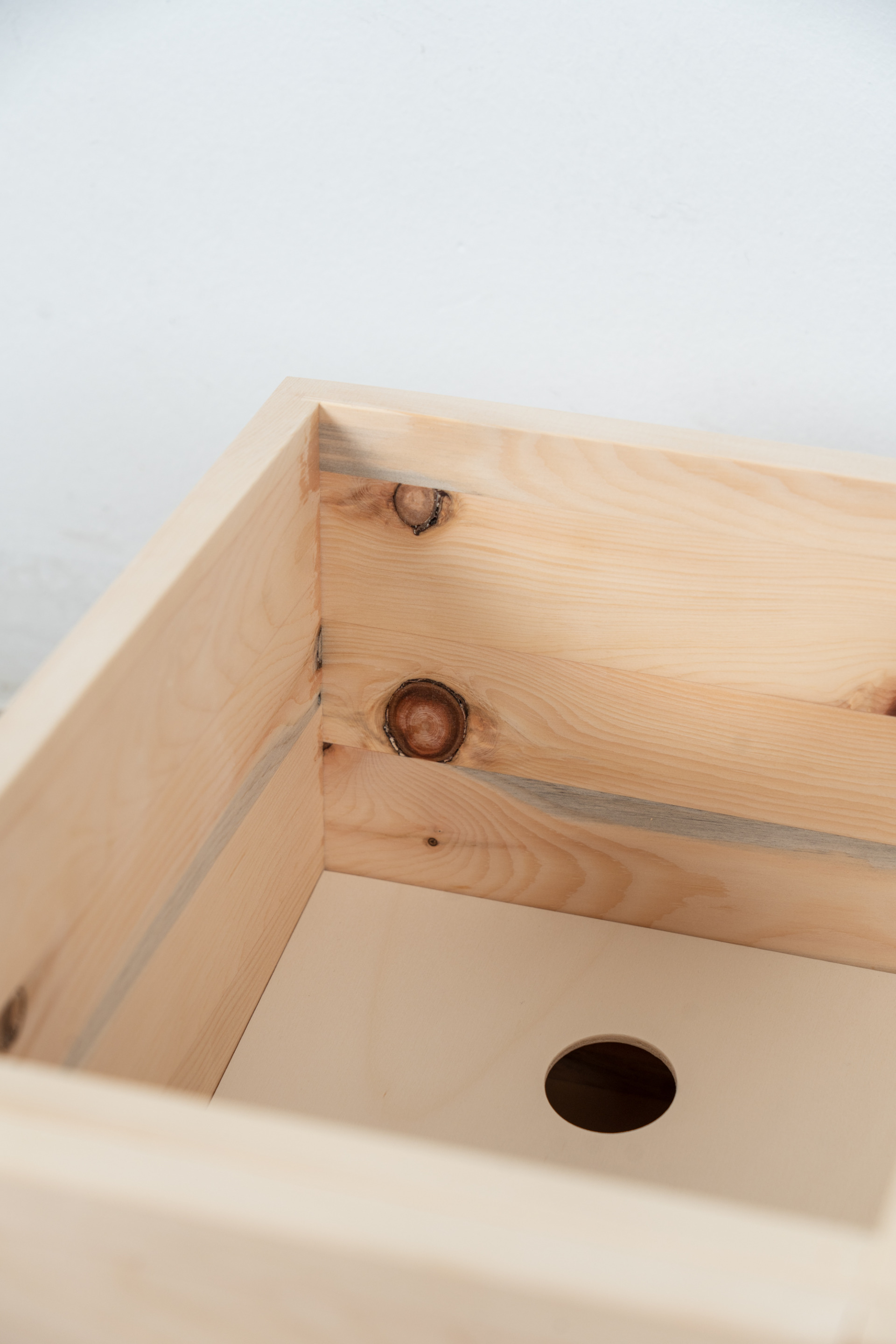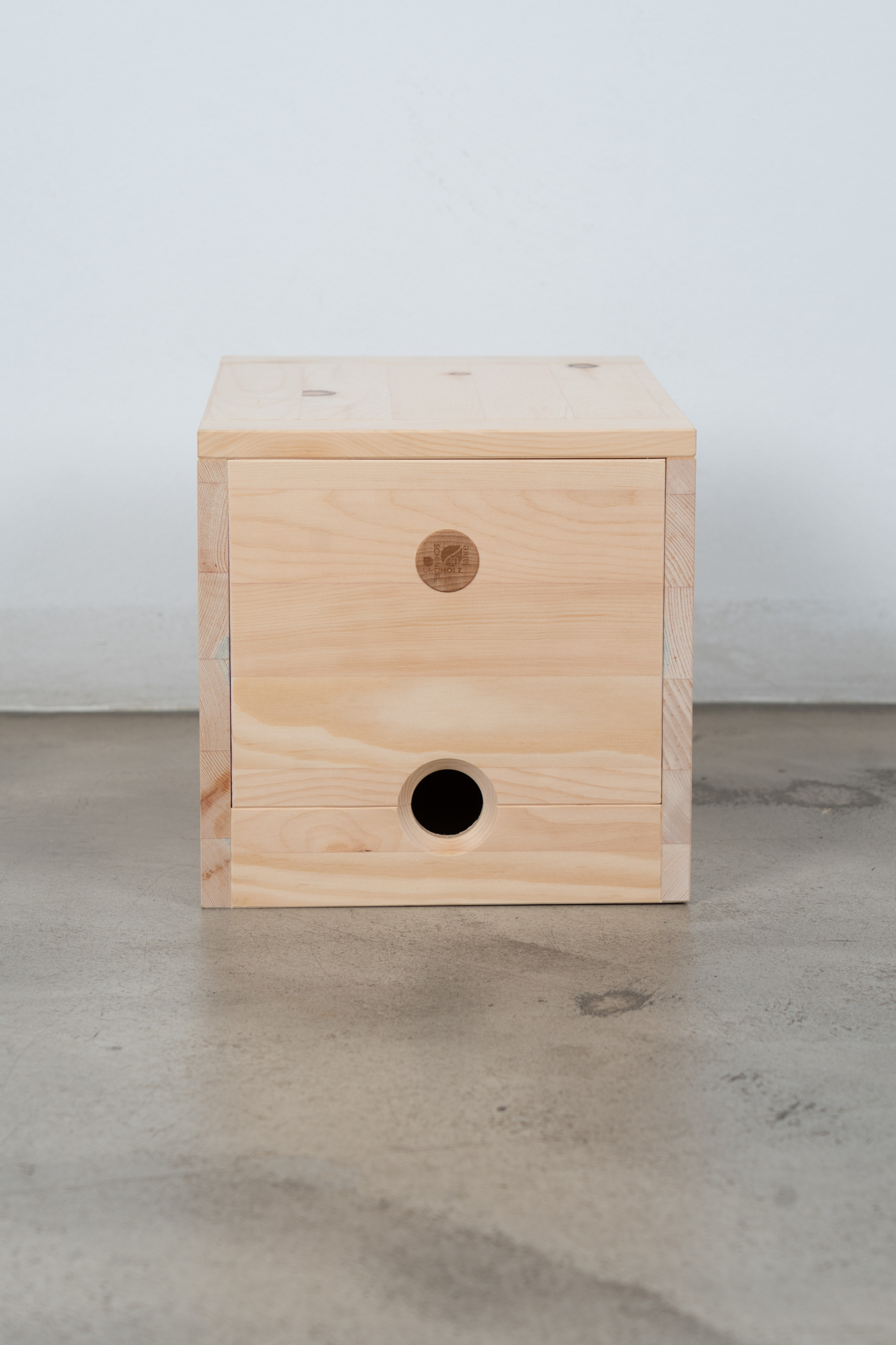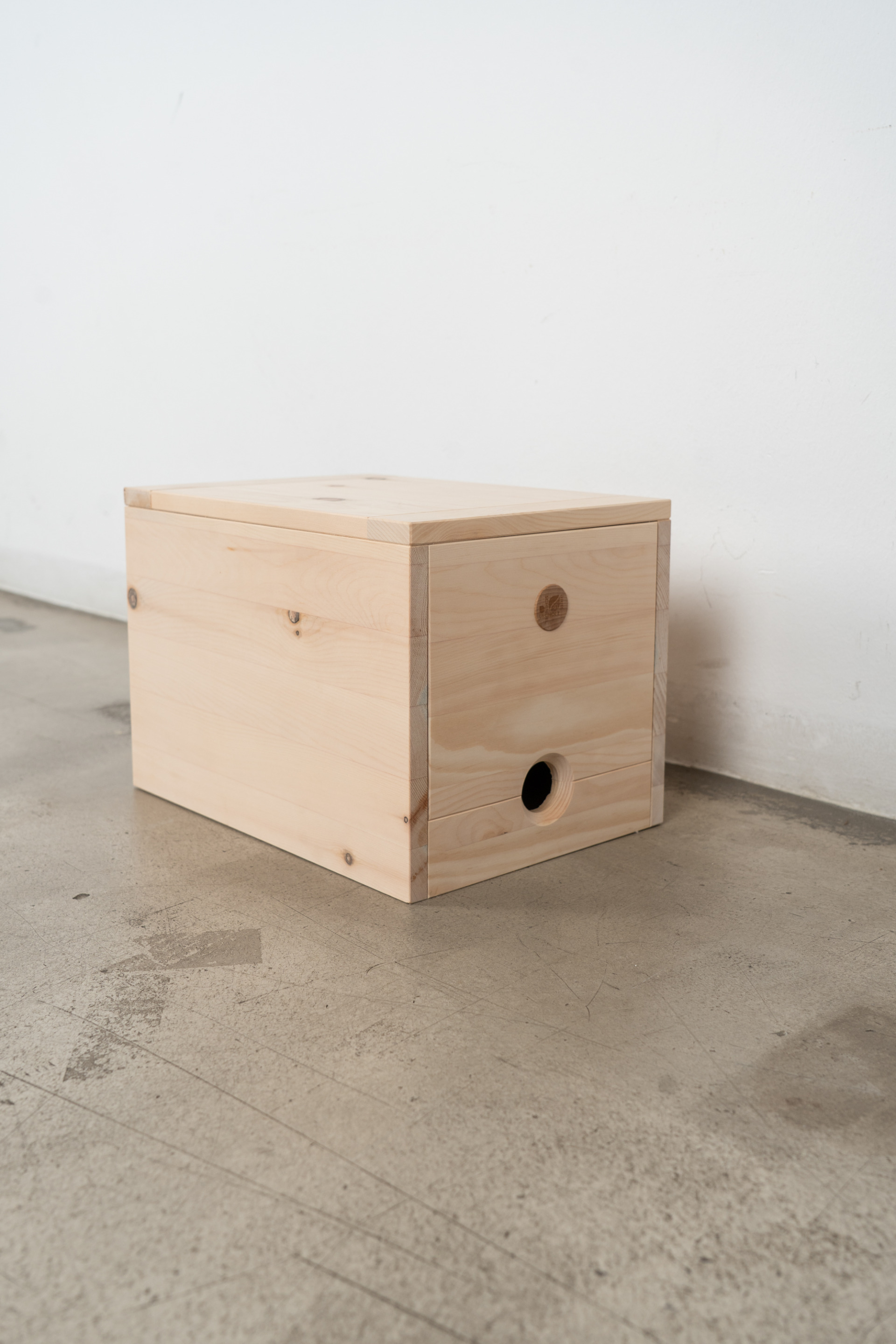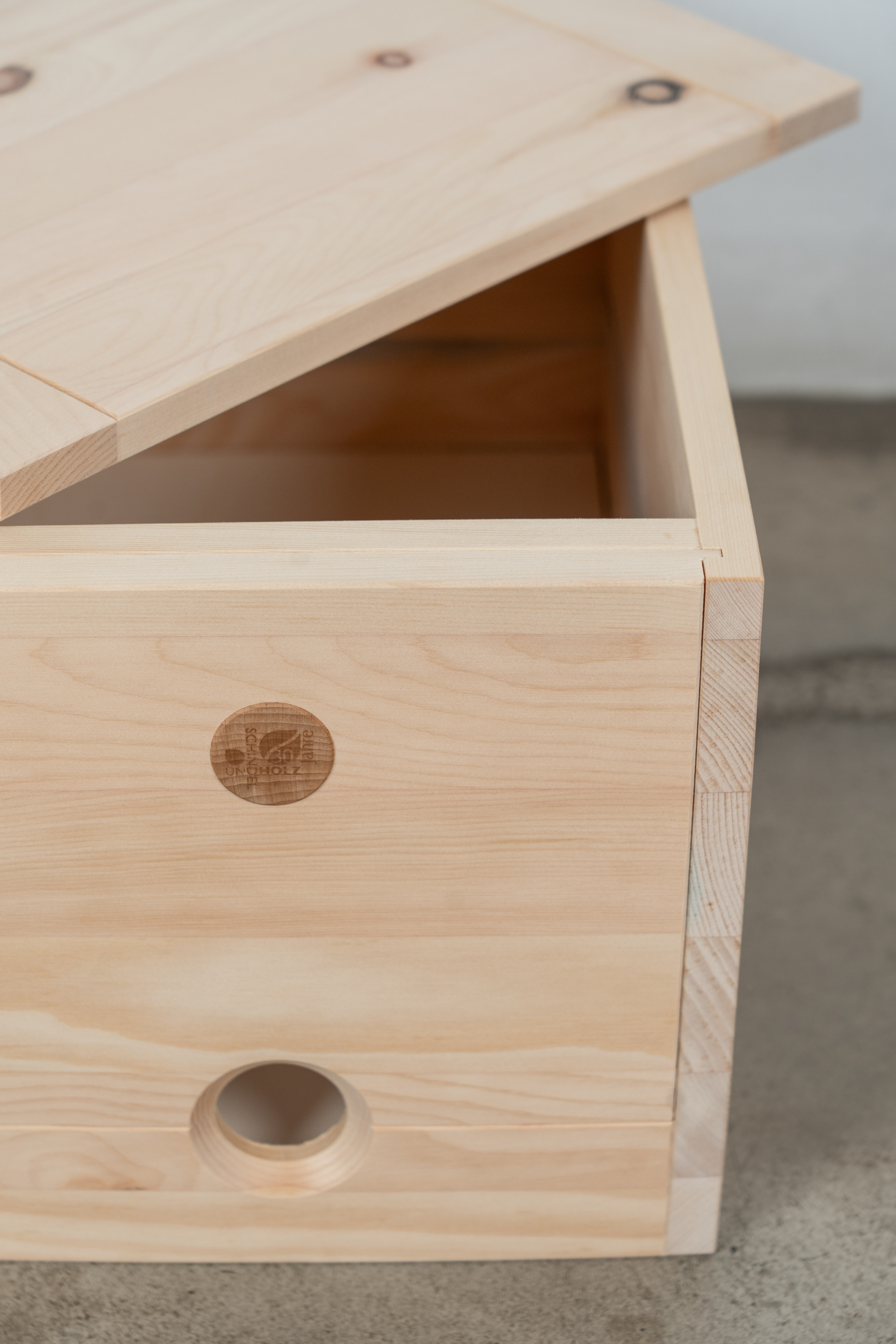 Gefertigt aus massiv verleimter Zirbe, Oberfläche natur geschliffen. Deckel, Vorderteil und Boden sind abnehmbar.