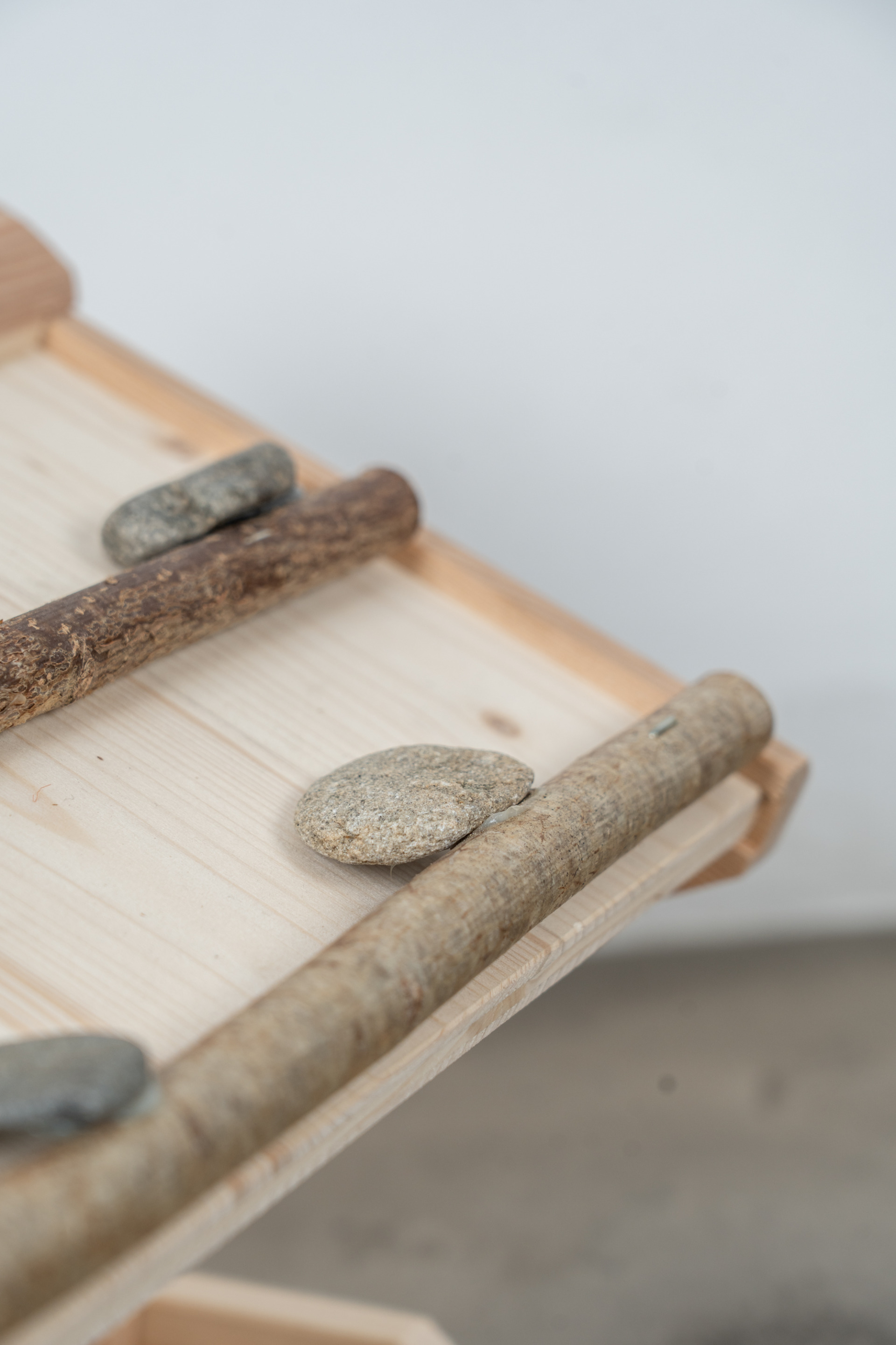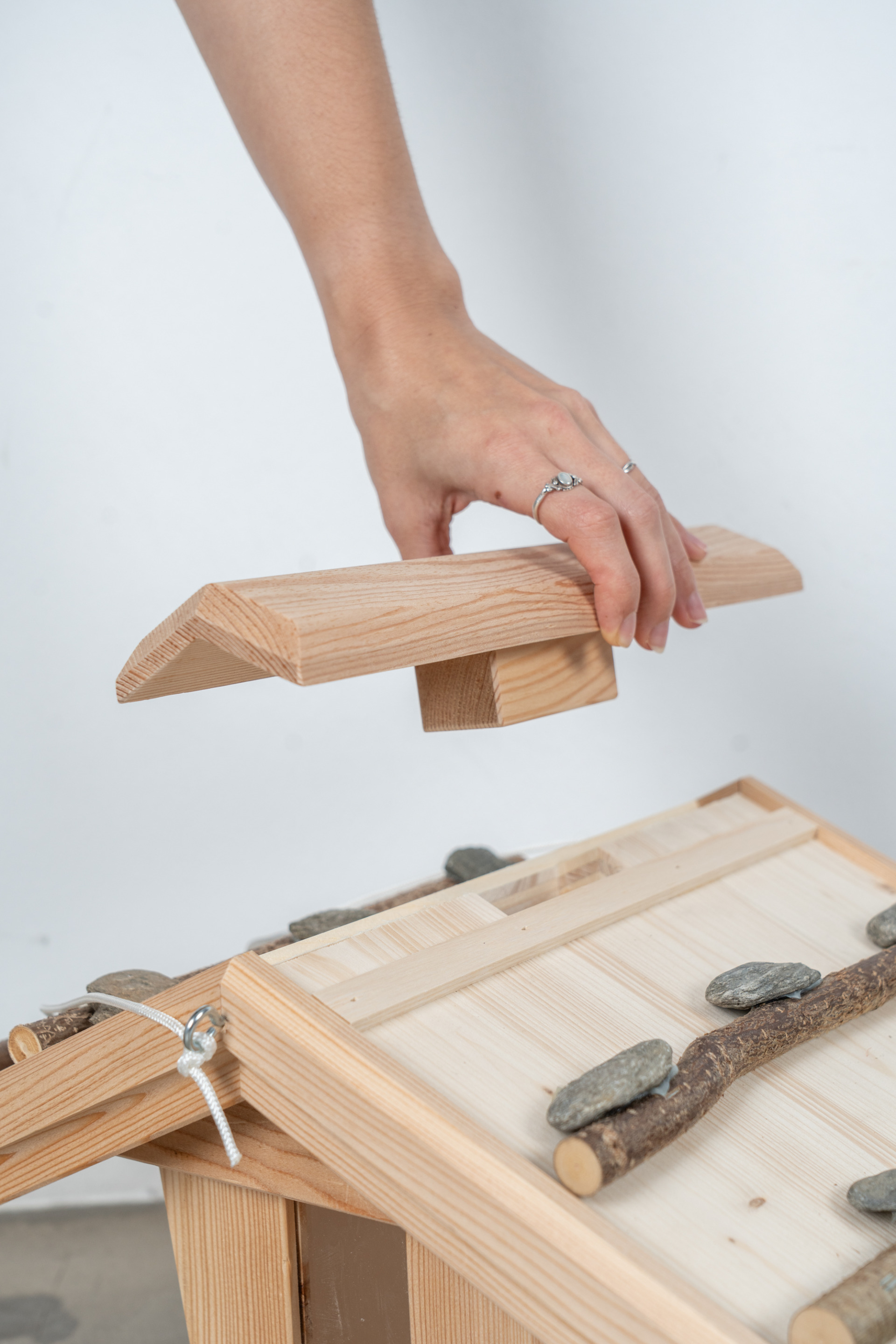 Dach in Lärche, Seitenteile mit Sichtfenster zur Kontrolle des Füllstands. Die Befüllung erfolgt praktisch über den Dachgiebel. Solide verarbeitet und für den dauerhaften Einsatz im Außenbereich geeignet.